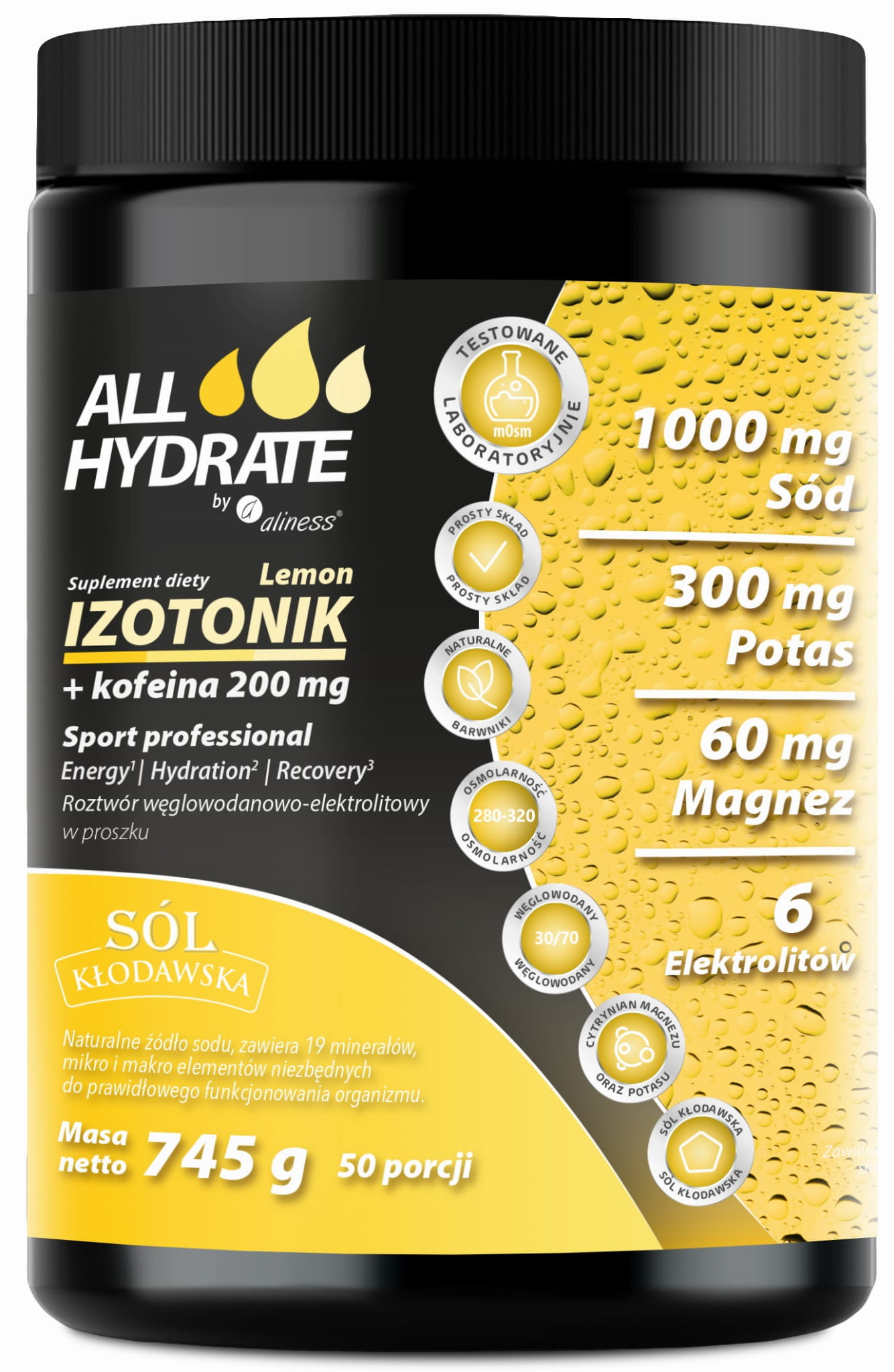 ALLHydrate - Izotonik Sport, Lemon+Kofeina 200mg, 745g, 50 porcji