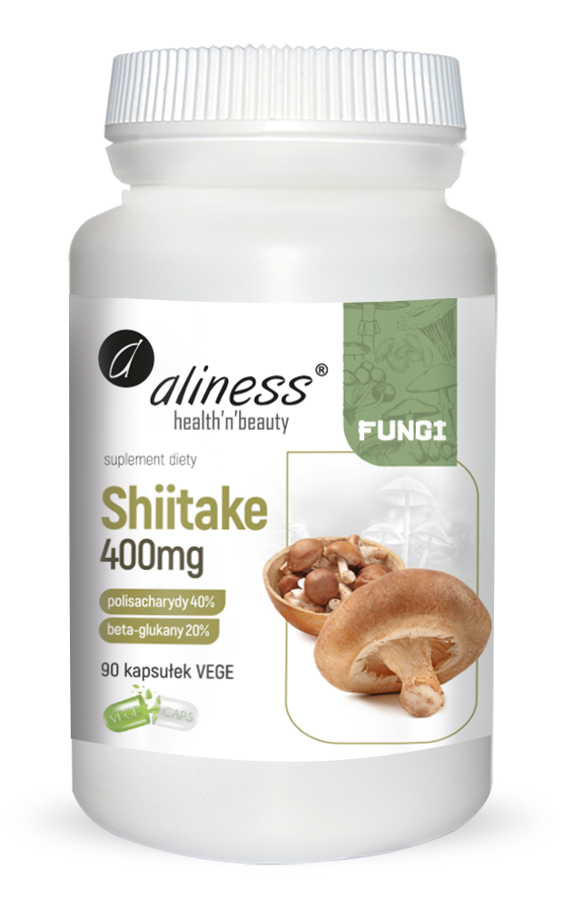 Aliness Shiitake 400 mg powstał w oparciu o wysokiej jakości, podwójnie standaryzowany ekstrakt z owocników grzybów Lentinula edodes, co gwarantuje zawartość aktywnych składników co najmniej na poziomie 40% wszystkich naturalnie występujących polisacharydów oraz 20% beta-glukanów.