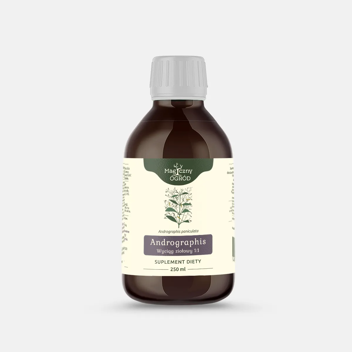 Andrographis (Andrographis paniculata) gorzka w smaku, jednoroczna roślina pochodząca z azjatyckich krajów tropikalnych. Dorasta do 110 cm. Występuje w Indiach. Jako surowiec zielarski wykorzystuje się ziele, korzenie oraz liście. Zawiera między innymi andrografolidy, a także flawonoidy, fitosterole, flawony i związki mineralne. Stosowany w Tradycyjnej Medycynie Chińskiej i Ajurwedzie. Wspiera naturalne procesy odpornościowe oraz poprawia apetyt. W wygodnej i bardzo dobrze przyswajalnej formie nalewki.