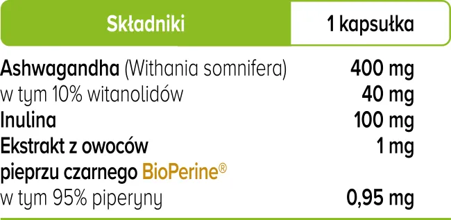 Ashwagandha* (Withania somnifera), standaryzowana na 10% witanolidów [DER 8:1], inulina, ekstrakt z owoców pieprzu czarnego standaryzowany na 95% piperyny BioPerine®, otoczka kapsułki: hydroksypropylometyloceluloza.