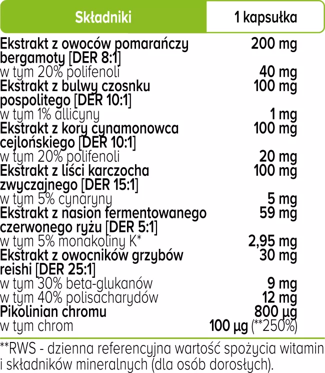 Składniki: ekstrakt z owoców pomarańczy bergamoty [DER 8:1] standaryzowany na 20% polifenoli, ekstrakt z bulwy czosnku pospolitego [DER 10:1] standaryzowany na 1% allicyny, ekstrakt z kory cynamonowca cejlońskiego [DER 10:1] standaryzowany na 20% polifenoli, ekstrakt z liści karczocha zwyczajnego [DER 15:1] standaryzowany na 5% cynaryny, ekstrakt z nasion fermentowanego czerwonego ryżu [DER 5:1] standaryzowany na 5% monakoliny K*, ekstrakt z owocników grzybów reishi [DER 25:1] standaryzowany na 30% beta-glukanów i 40% polisacharydów, pikolinian chromu (chrom), otoczka kapsułki: hydroksypropylometyloceluloza. *Zawartość monakoliny K w przeliczeniu na porcję produktu – 2,95 mg.