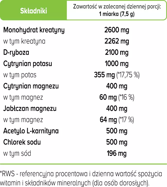 Składniki: Monohydrat kreatyny (kreatyna), d-ryboza, cytrynian potasu (potas), cytrynian magnezu (magnez), jabłczan magnezu (magnez), acetylo l-karnityna, chlorek sodu (sód), naturalny aromat cytrynowy.