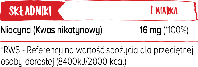 Składniki: Niacyna (kwas nikotynowy) 100%.