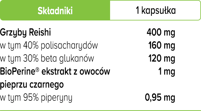 Grzyby Reishi – Lakownica żółtawa (Ganoderma lucidum (Curtis) P. Karst.) ekstrakt z owocników standaryzowany na 40% polisacharydów i 30% beta-glukanów [DER 25:1], BioPerine® ekstrakt z owoców pieprzu czarnego standaryzowany na 95% piperyny, otoczka kapsułki: hydroksypropylometyloceluloza.