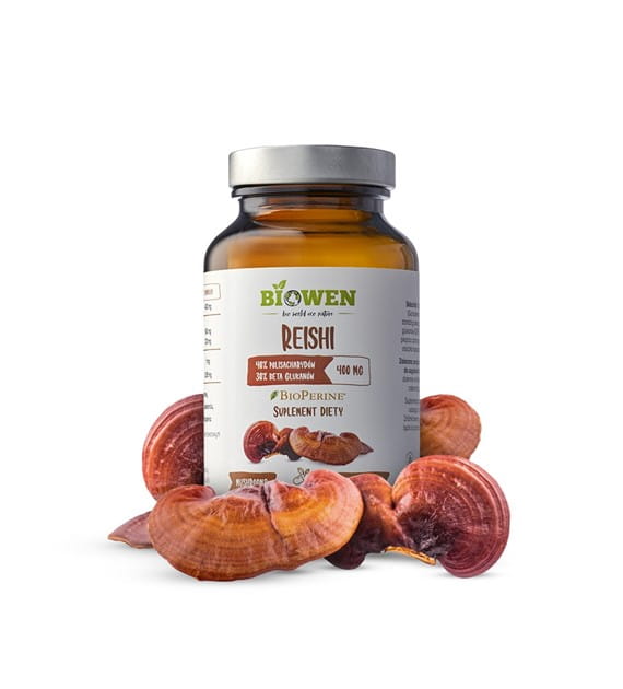 Grzyby Reishi w kapsułkach Biowen, inaczej lakownica żółtawa, to grzyb witalny znany głównie w tradycyjnej medycynie chińskiej. Nasz ekstrakt Reishi to aż 40% polisacharydów, w tym 30% najważniejszych z nich, czyli beta-glukanów! Dodatkowo ekstrakt z Reishi wsparliśmy ekstraktem BioPerine®, który dodaje mu cennych właściwości i wspiera jego działanie w naturalny sposób! Lakownica żółtawa użyta w naszym produkcie to ekstrakt z owocników Reishi, z DER 25:1.
