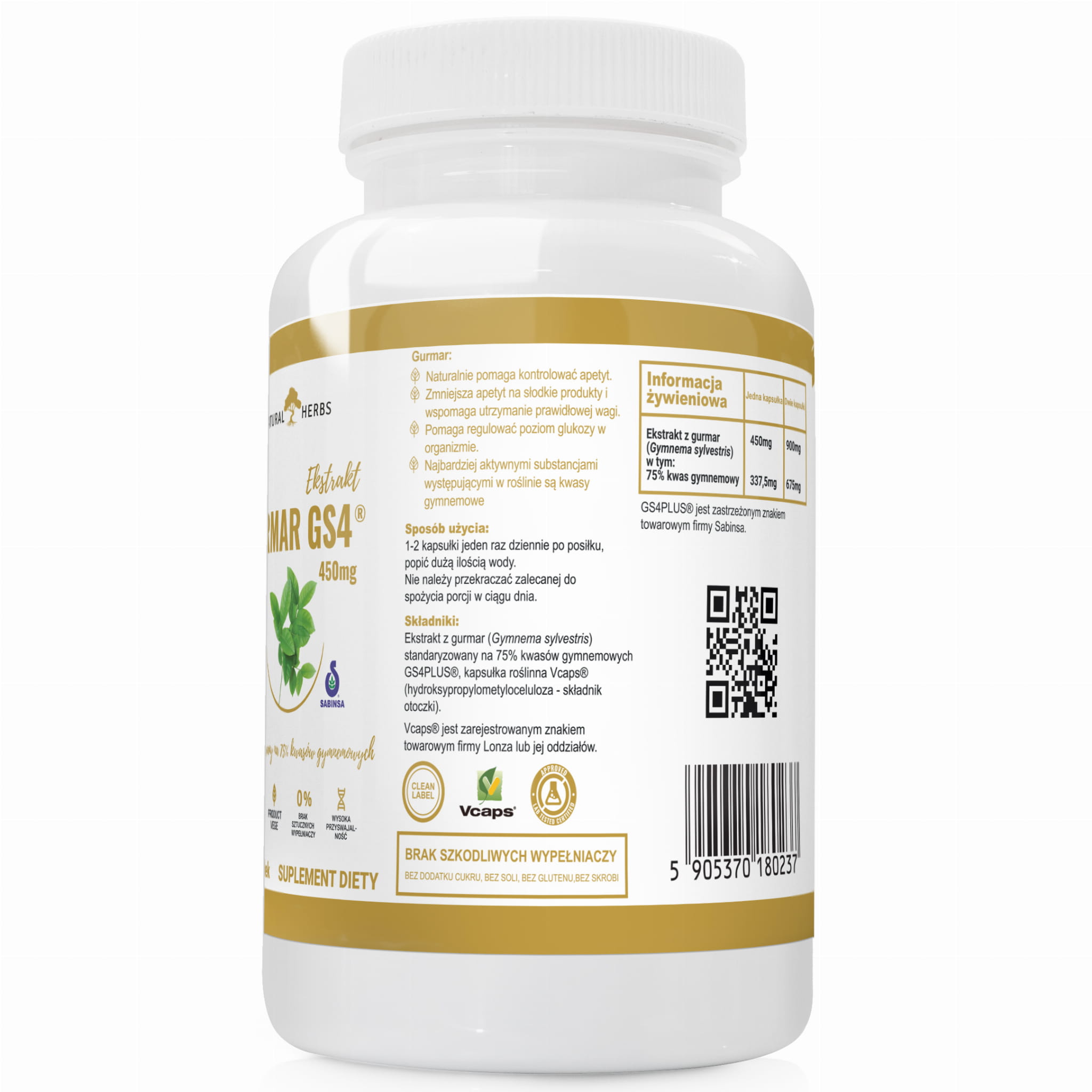 SKŁADNIKI: Ekstrakt z gurmar (Gymnema sylvestris) standaryzowany na 75% kwasów gymnemowych GS4PLUS®, kapsułka roślinna Vcaps® (hydroksypropylometyloceluloza - składnik otoczki).