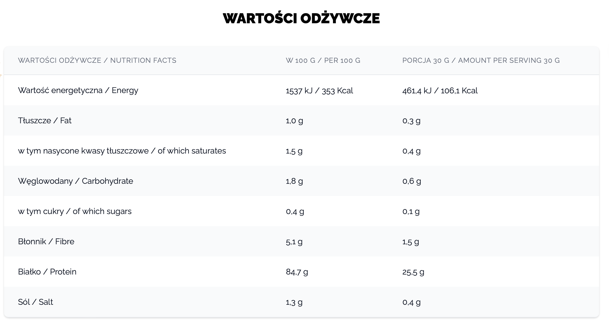 WARTOŚCI ODŻYWCZE / NUTRITION FACTS W 100 G / PER 100 G PORCJA 30 G / AMOUNT PER SERVING 30 G