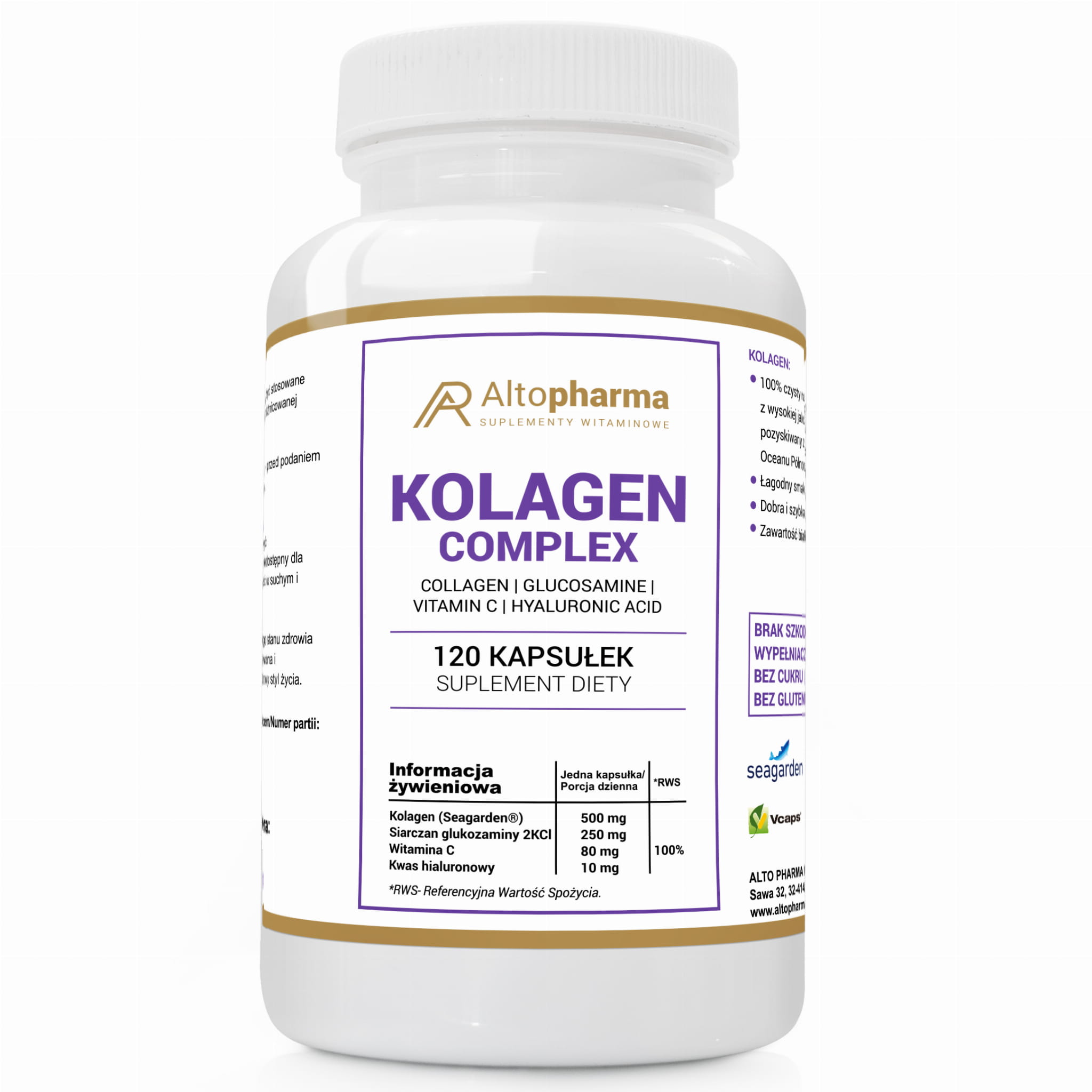 KOLAGEN COMPLEX - Kolagen (Seagarden®),Siarczan glukozaminy 2KCI, Witamina C, Kwas hialuronowy - Altopharma - 120 kapsułek