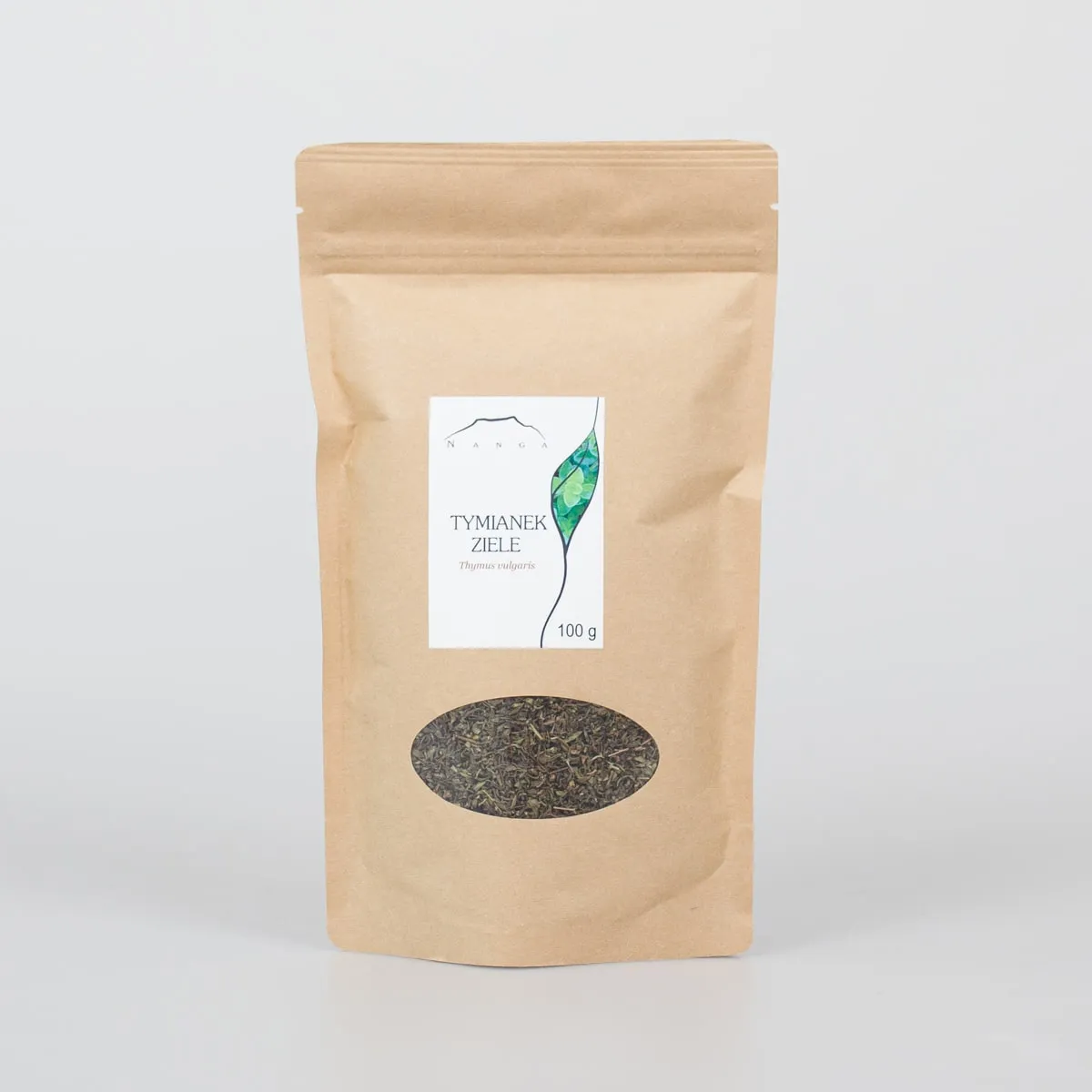 Tymianek pospolity (Thymus vulgaris) – zwany także macierzanką tymianek, jest to niewielka roślina osiągająca do 30 cm wysokości, o pionowej łodydze, drobnych liściach oraz białych lub różowych kwiatach. Pochodzi z rejonów Morza Śródziemnego. Surowcem zielarskim jest ziele tymianku, zawierające cenne olejki eteryczne, m.in.: karwakrol, tymol, linalol, borneol. Obok nich znajdziemy w nim również flawonoidy, taniny, saponiny oraz kwasy triterpenowe. W całej Europie oraz na Bliskim Wschodzie od wieków jest to wysoko ceniona przyprawa dodawana do potraw, by nadać im niepowtarzalny aromat i smak. Dawniej tymianek stanowił także ważny element medycyny ludowej. To wszystko za sprawą doskonałej kompozycji składników, które odpowiadają za przyjemny zapach oraz za właściwości przeciwdrobnoustrojowe i antyoksydacyjne tymianku. Thymus vulgaris wpływa korzystnie na górne drogi oddechowe, rozrzedza zalegającą wydzielinę oraz łagodzi chrypkę. Suszone ziele tymianku można spożywać w postaci aromatycznych, rozgrzewających naparów albo zastosować jako dodatek do sosów, zup, sałatek oraz dań mięsnych i warzywnych.