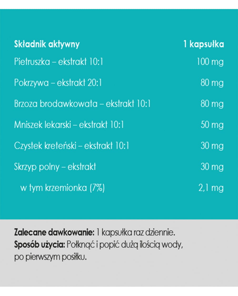 Skład: Ekstrakt z korzenia pietruszki zwyczajnej (Petroselinum crispim) 10:1, ekstrakt z liści pokrzywy zwyczajnej (Urtica dioica) 20:1, ekstrakt z liści brzozy brodawkowatej (Betula pendula) 20:1, ekstrakt z korzenia mniszka lekarskiego (Taraxacum officinale) 10:1, ekstrakt z ziela czystka kreteńskiego (Cistus creticus) 10:1, ekstrakt z ziela skrzypu polnego (Equisetum arvense) standaryzowany na zawartość min. 7% krzemionki, substancja wypełniająca: inulina z korzenia cykorii (prebiotyk) Skład kapsułki: Celuloza roślinna (wegetariańskie)