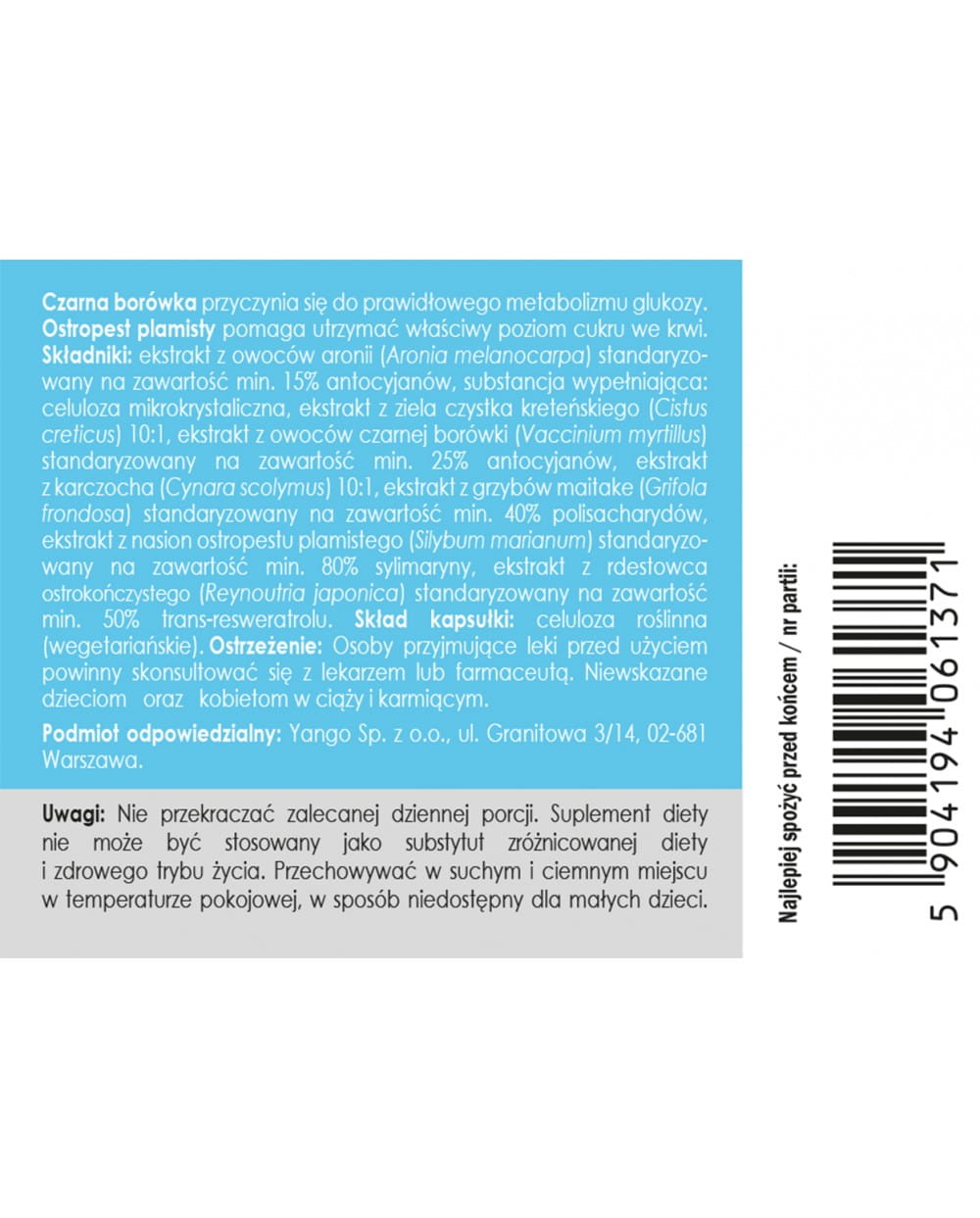Składniki: Ekstrakt z owoców aronii (Aronia melanocarpa) stardaryzowany na zawartość min. 15% antocyjanów, substancja wypełniająca: celuloza mikrokrystaliczna, ekstrakt z ziela czystka kreteńskiego (Cistus creticus) 10:1, ekstrakt z owoców czarnej borówki (Vaccinium myrtillus) standaryzowany na zawartość min. 25% antocyjanów, ekstrakt z karczocha (Cynara scolymus) 10:1, ekstrakt z grzybów maitake (Grifola frondosa) standaryzowany na zawartość min. 40% polisacharydów, ekstrakt z nasion ostropestu plamistego (Silybum marianum) standaryzowany na zawartość min. 80% sylimaryny, ekstrakt z rdestowca ostrokończystego (Reyonutria japonica) standaryzowany na zawartość min. 50% trans-resweratrolu. Skład kapsułki: celuloza roślinna (wegetariańskie)