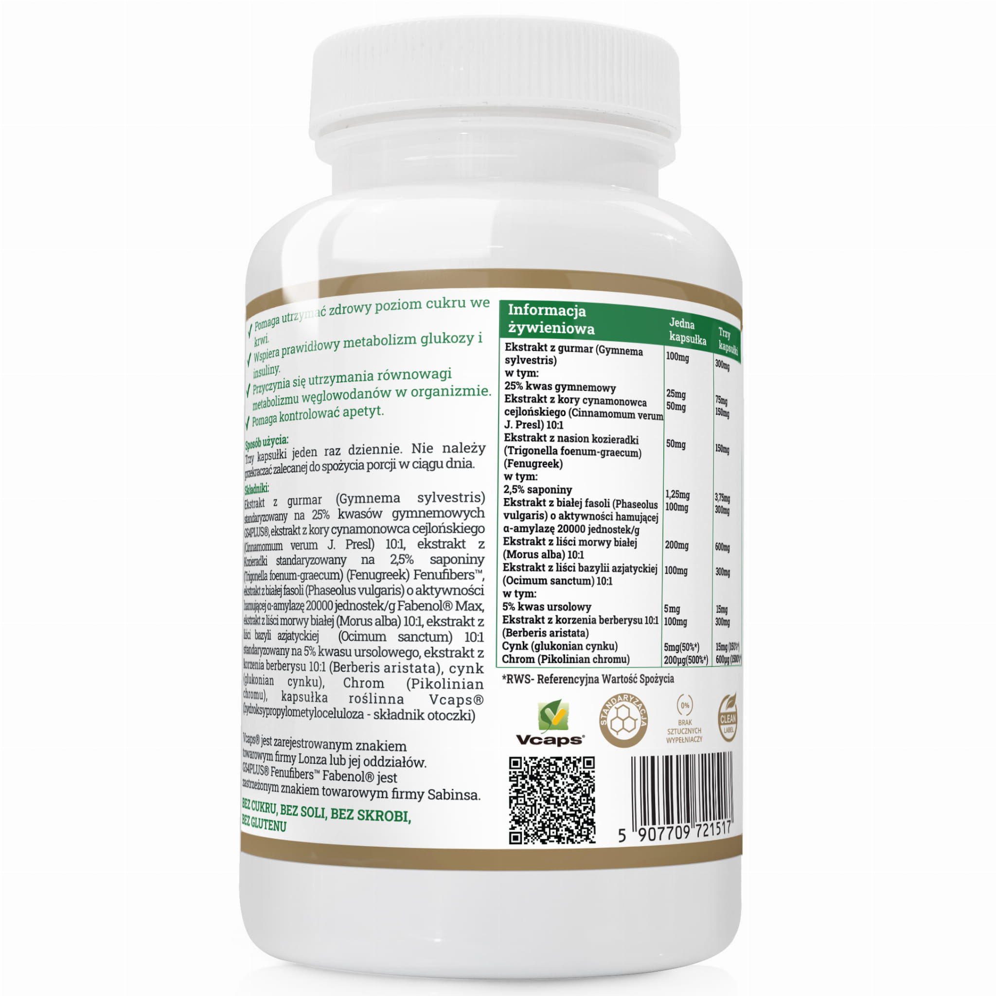 Składniki: Ekstrakt z gurmar (Gymnema sylvestris) standaryzowany na 25% kwasów gymnemowych GS4PLUS®, ekstrakt z kory cynamonowca cejlońskiego (Cinnamomum verum J. Presl) 10:1, ekstrakt z nasion kozieradki standaryzowany na 2,5% saponiny (Trigonella foenum-graecum) (Fenugreek) Fenufibers™, ekstrakt z białej fasoli (Phaseolus vulgaris) o aktywności hamującej α-amylazę 20000 jednostek/g Fabenol® Max, ekstrakt z liści morwy białej (Morus alba) 10:1, ekstrakt z liści bazylii azjatyckiej (Ocimum sanctum) 10:1 standaryzowany na 5% kwasu ursolowego, ekstrakt z korzenia berberysu 10:1 (Berberis aristata), cynk (glukonian cynku), Chrom (Pikolinian chromu), kapsułka roślinna Vcaps® (hydroksypropylometyloceluloza – składnik otoczki).