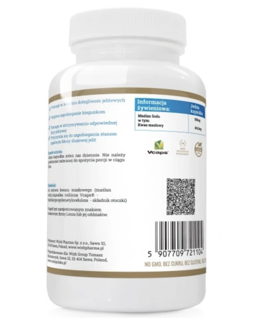 SKŁADNIKI: Sól sodowa kwasu masłowego (maślan sodu), kapsułka roślinna Vcaps® (hydroksypropylometyloceluloza - składnik otoczki).