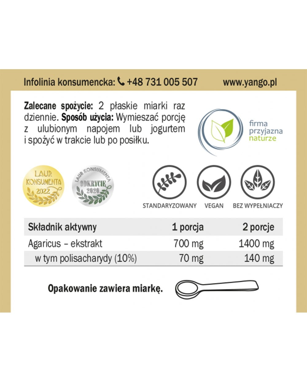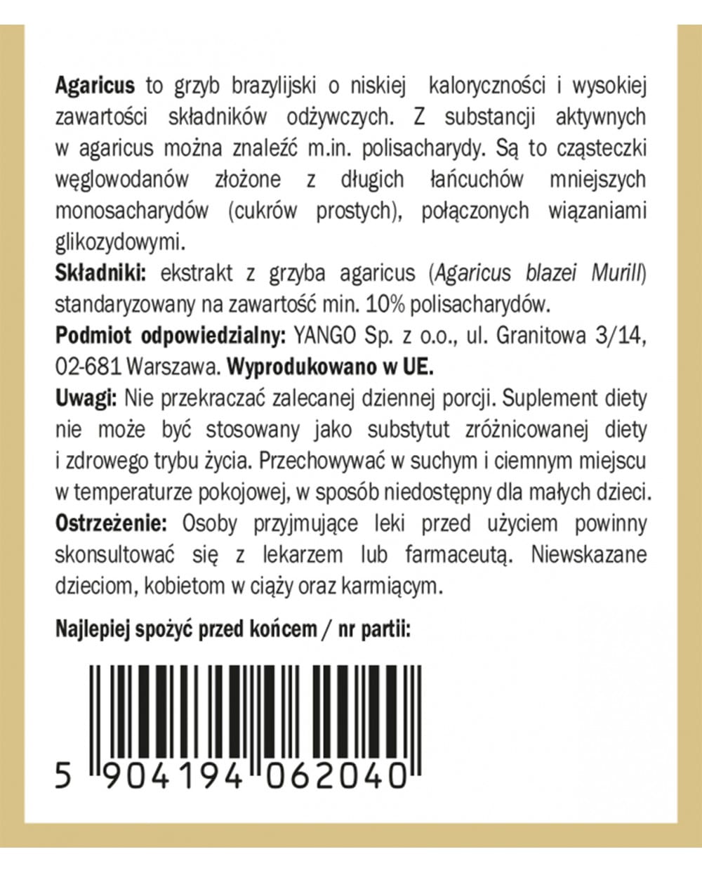 Składniki: ekstrakt z grzyba agaricus (Agaricus blazei Murill) standaryzowany na zawartość min. 10% polisacharydów. Podmiot odpowiedzialny: YANGO Sp. z o.o. Wyprodukowane w UE. Masa netto: 50 g.