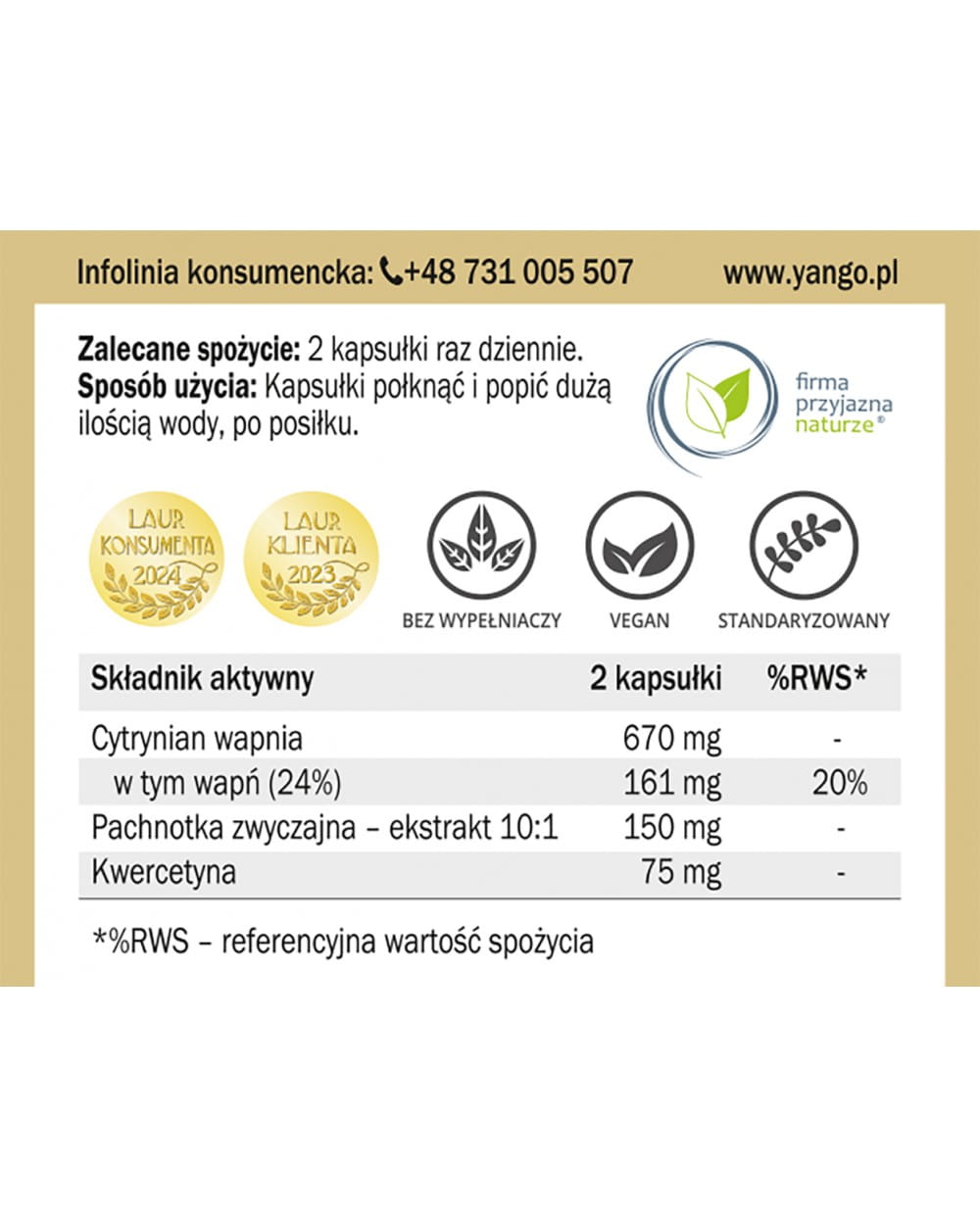 Cytrynian wapnia 670 mg - w tym wapń (24%) 161 mg 20%