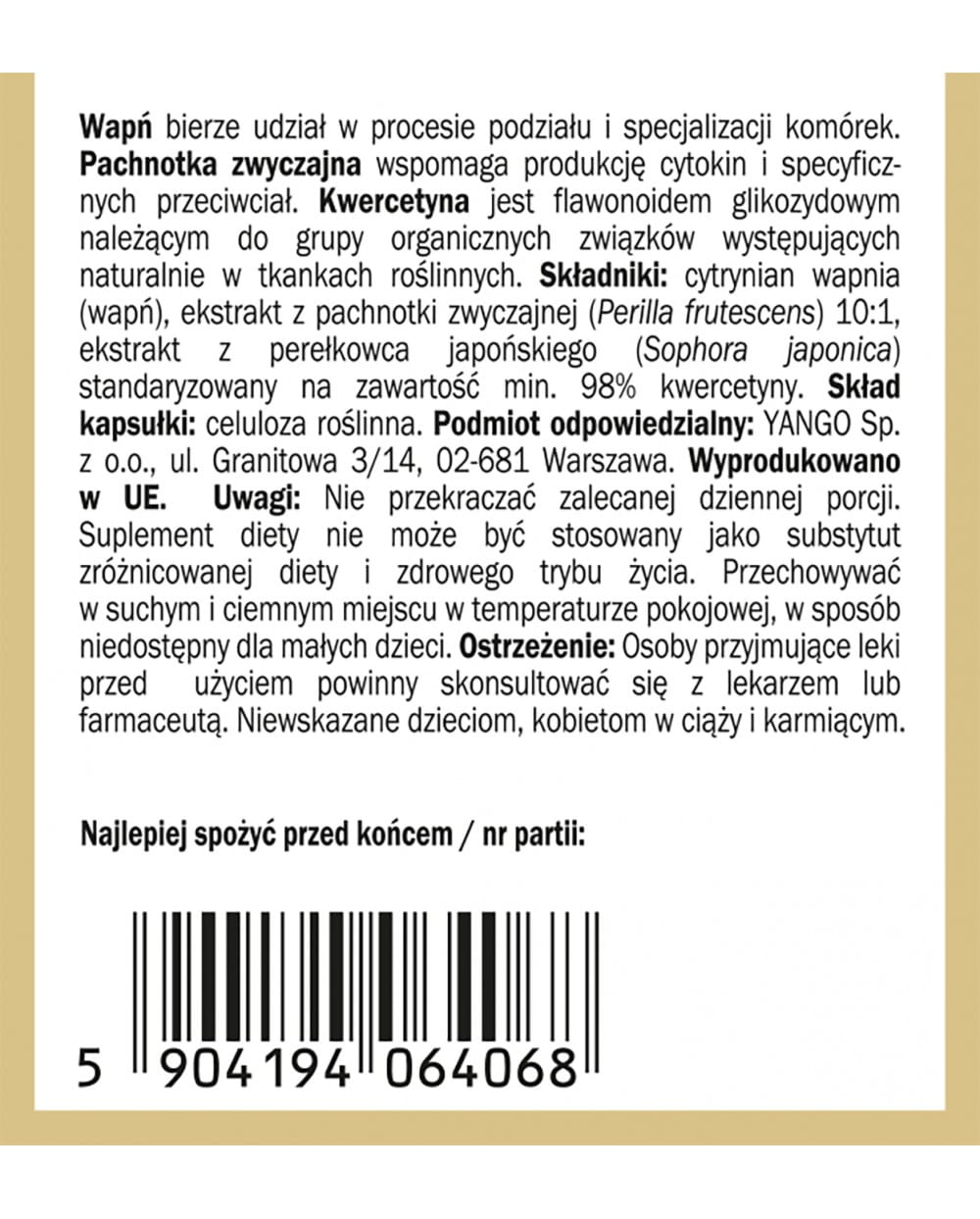 Składniki: cytrynian wapnia (wapń), ekstrakt z pachnotki zwyczajnej (Perilla frutescens) 10:1, ekstrakt z perełkowca japońskiego (Sophora japonica) standaryzowany na zawartość min. 98% kwercetyny.