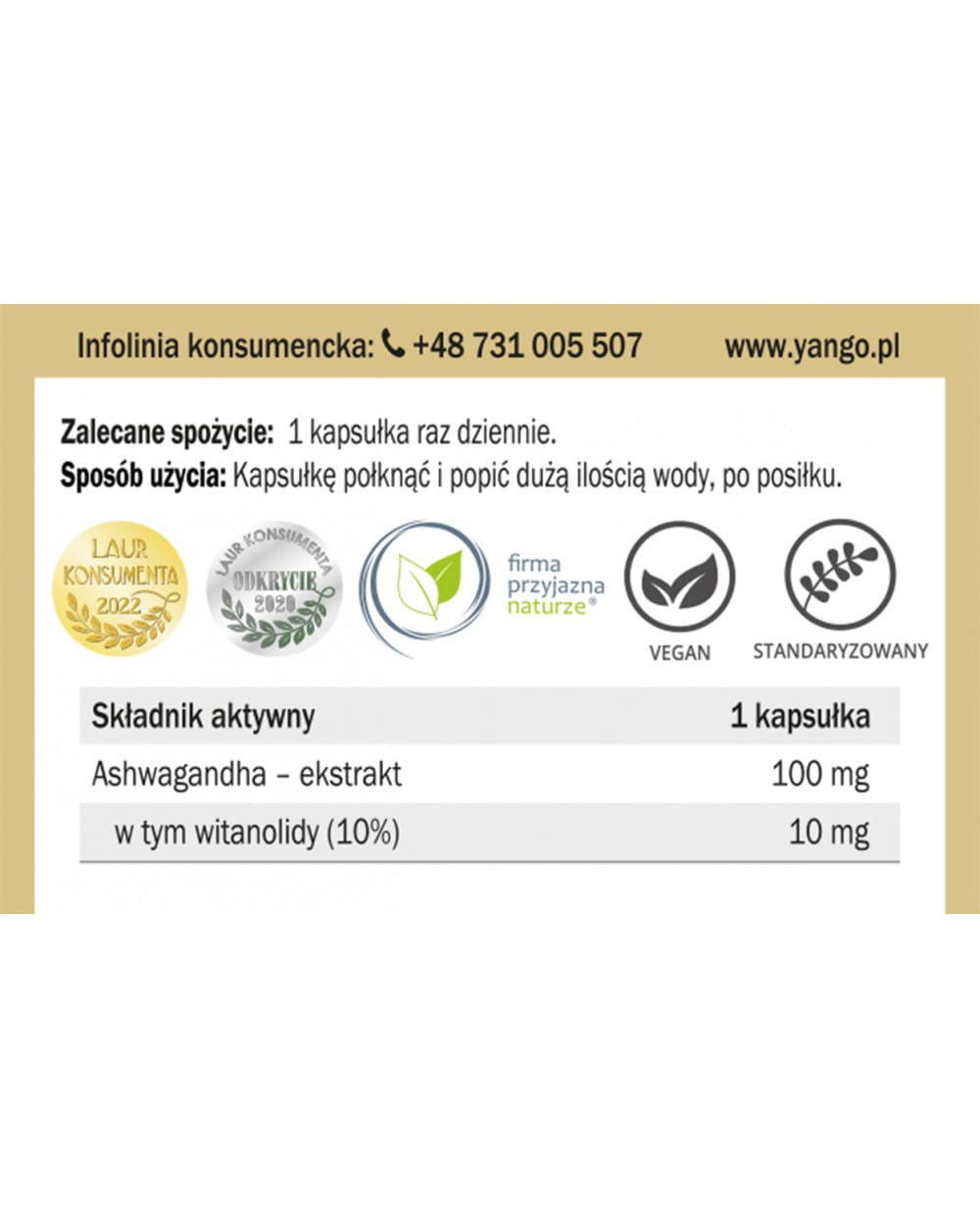 Ashwagandha - ekstrakt 100 mg w tym witanolidy (10%) 10 mg