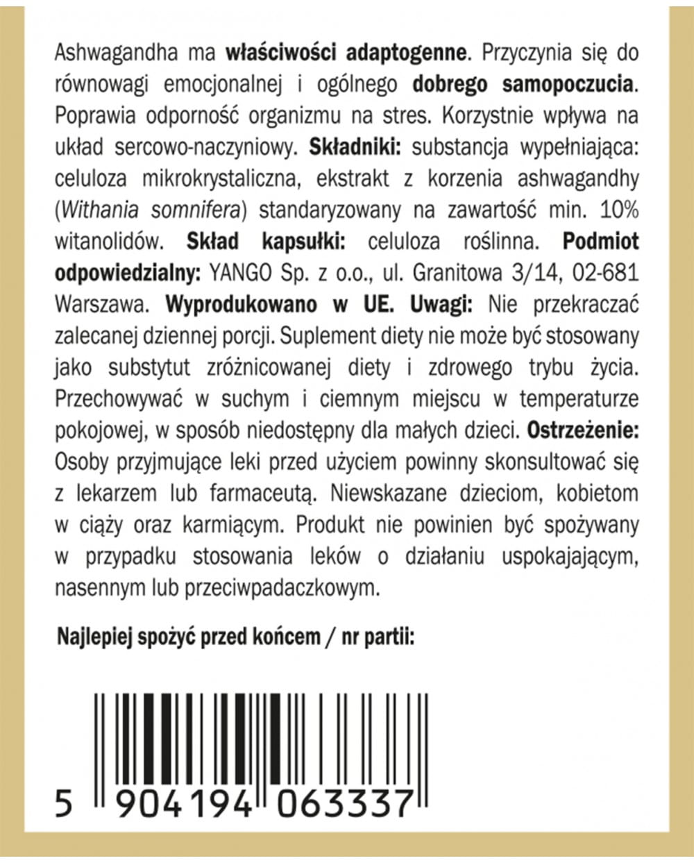 Skład: Substancja wypełniająca: celuloza mikrokrystaliczna, ekstrakt z korzenia ashwagandhy (Withania somnifera) standaryzowany na zawartość min. 10% witanolidów. Skład kapsułki: celuloza roślinna