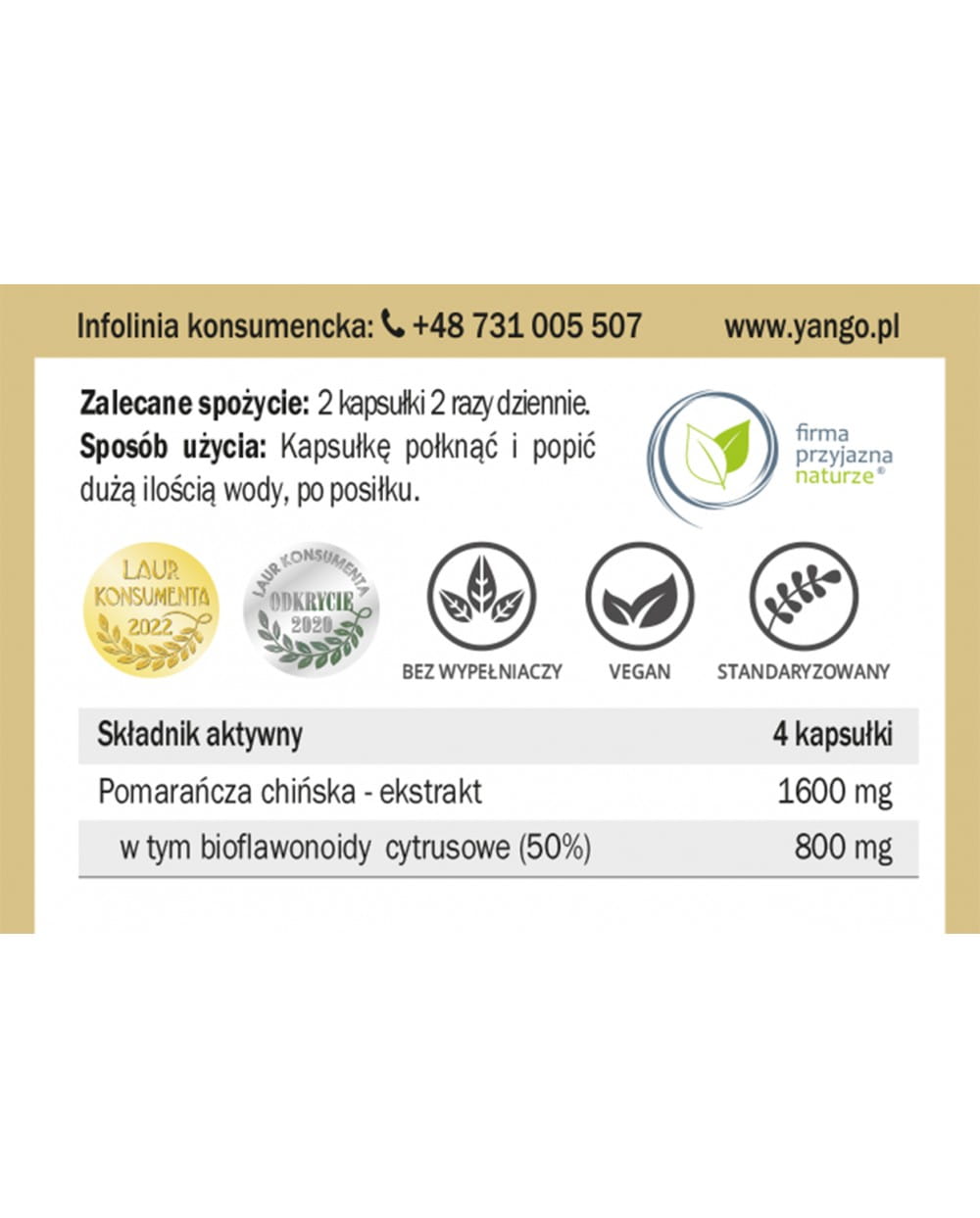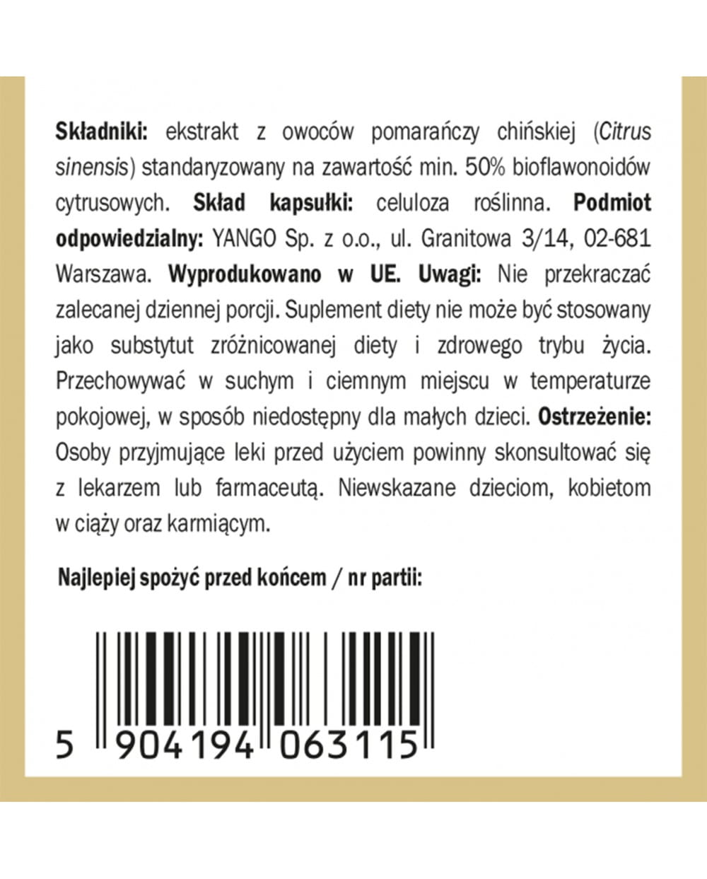 Składniki: Ekstrakt z owoców pomarańczy chińskiej (Citrus sinensis) standaryzowany na zawartośc min. 50% bioflawonoidów cytrusowych. Skład kapsułki: celuloza roślinna. Podmiot odpowiedzialny: YANGO Sp. z o.o. ul. Granitowa 3/14, 02-681 Warszawa. Wyprodukowano w UE. Masa netto: 44,1 g
