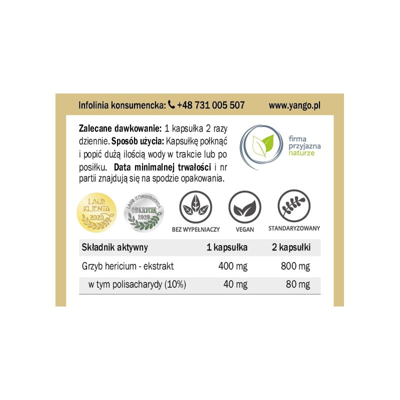 Yango - Hericium - ekstrakt 10% polisacharydów - 90 kaps. - Grzyb Witalny