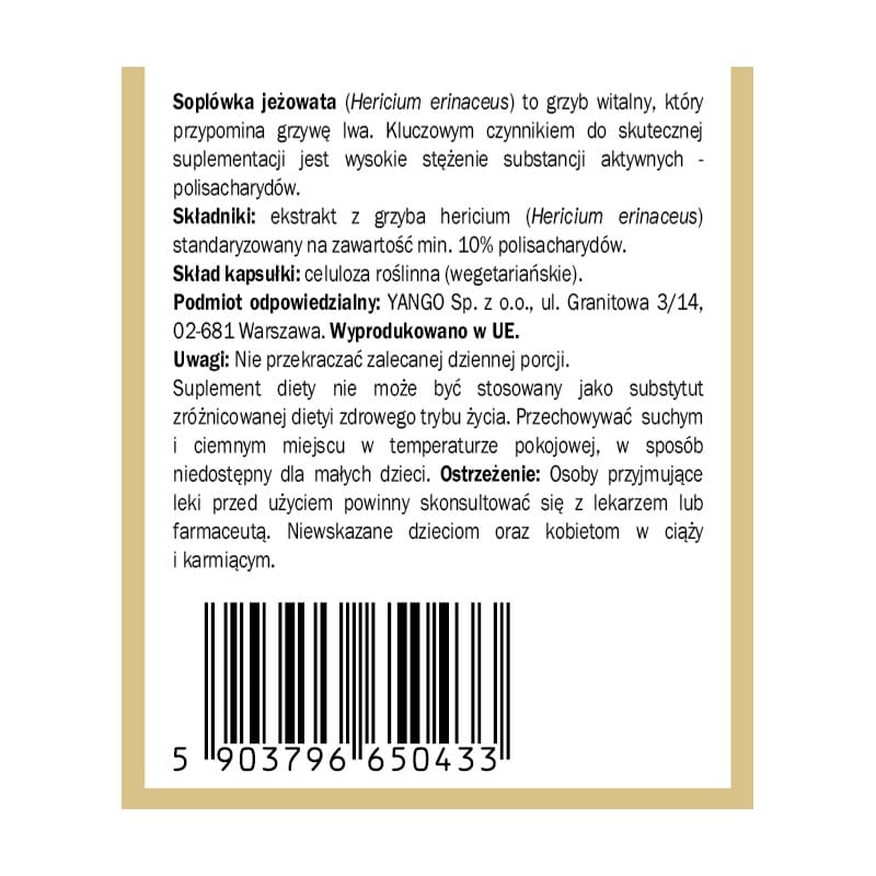 Skład: ekstrakt z grzyba Hericium (Hericium erinaceus) standaryzowany na 10% zawartości polisacharydów; otoczka kapsułki: celuloza roślinna.