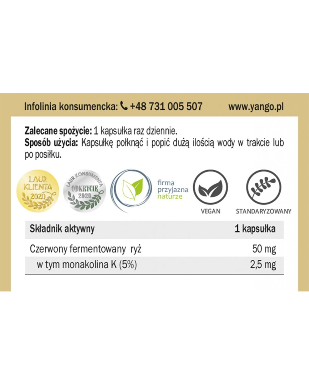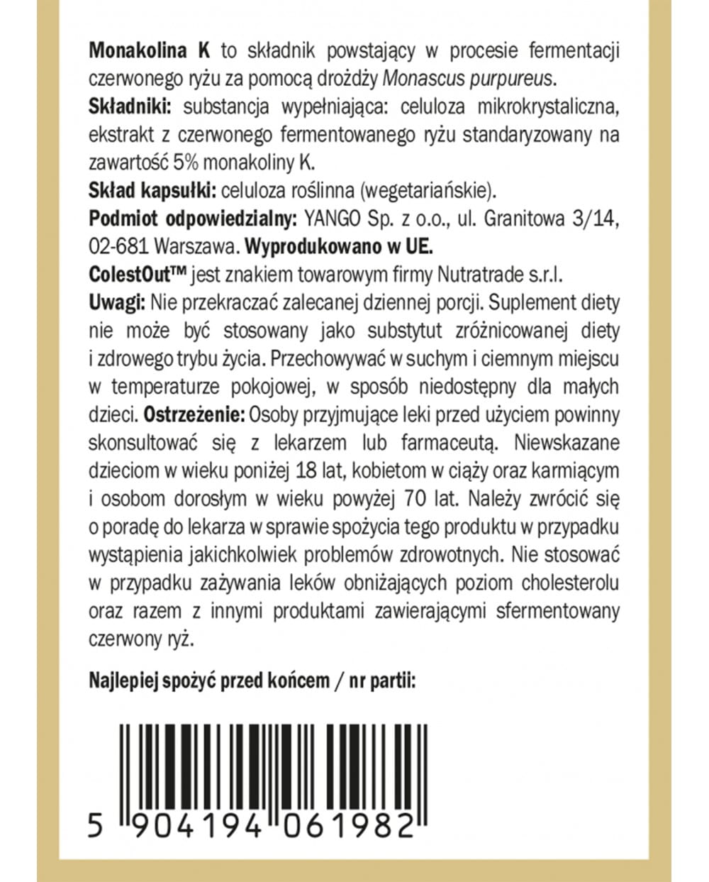 Składniki:  celuloza mikrokrystaliczna, ekstrakt z czerwonego fermentowanego ryżu standaryzowany na zawartość 5% monakoliny K.