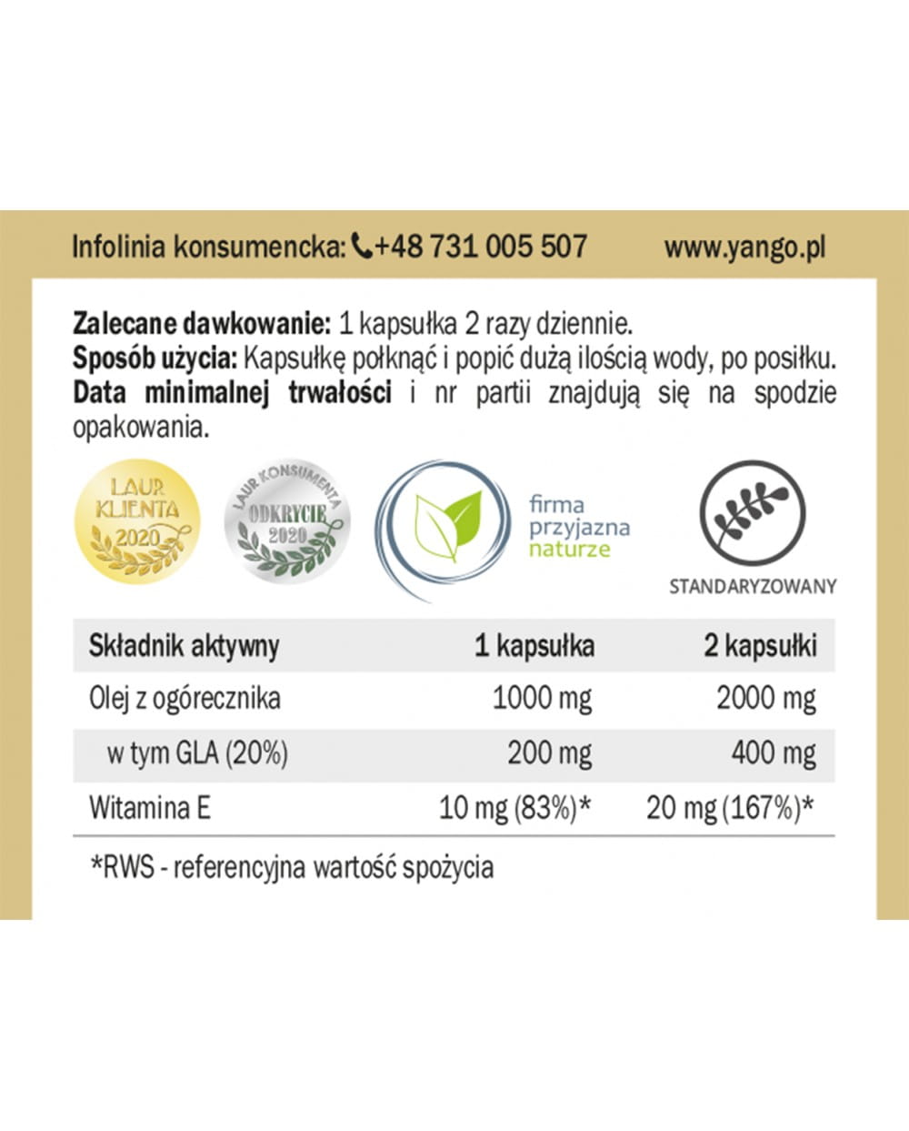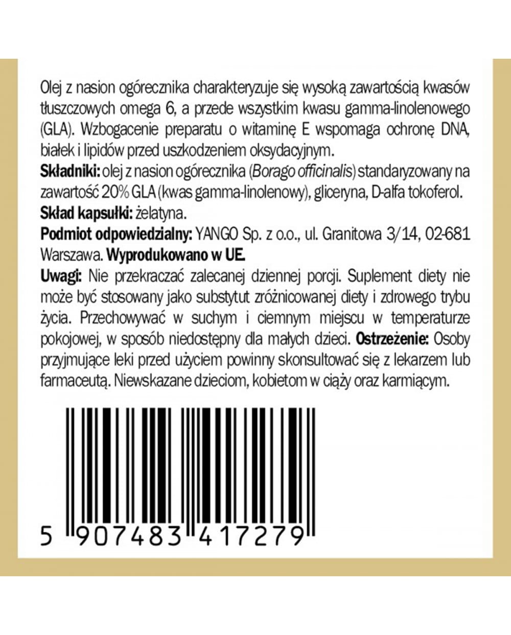 Składniki: Olej z nasion ogórecznika (Borago officinalis) standaryzowany na zawartość 20% GLA (kwas gamma-linolenowy), gliceryna, D-alfa tokoferol. Skład kapsułki: żelatyna,substancja utrzymująca wilgoć:glicerol. Podmiot odpowiedzialny: YANGO Sp. z o.o. ul. Granitowa 3/14, 02-681 Warszawa. Wyprodukowano w UE. Masa netto: 80,7g.