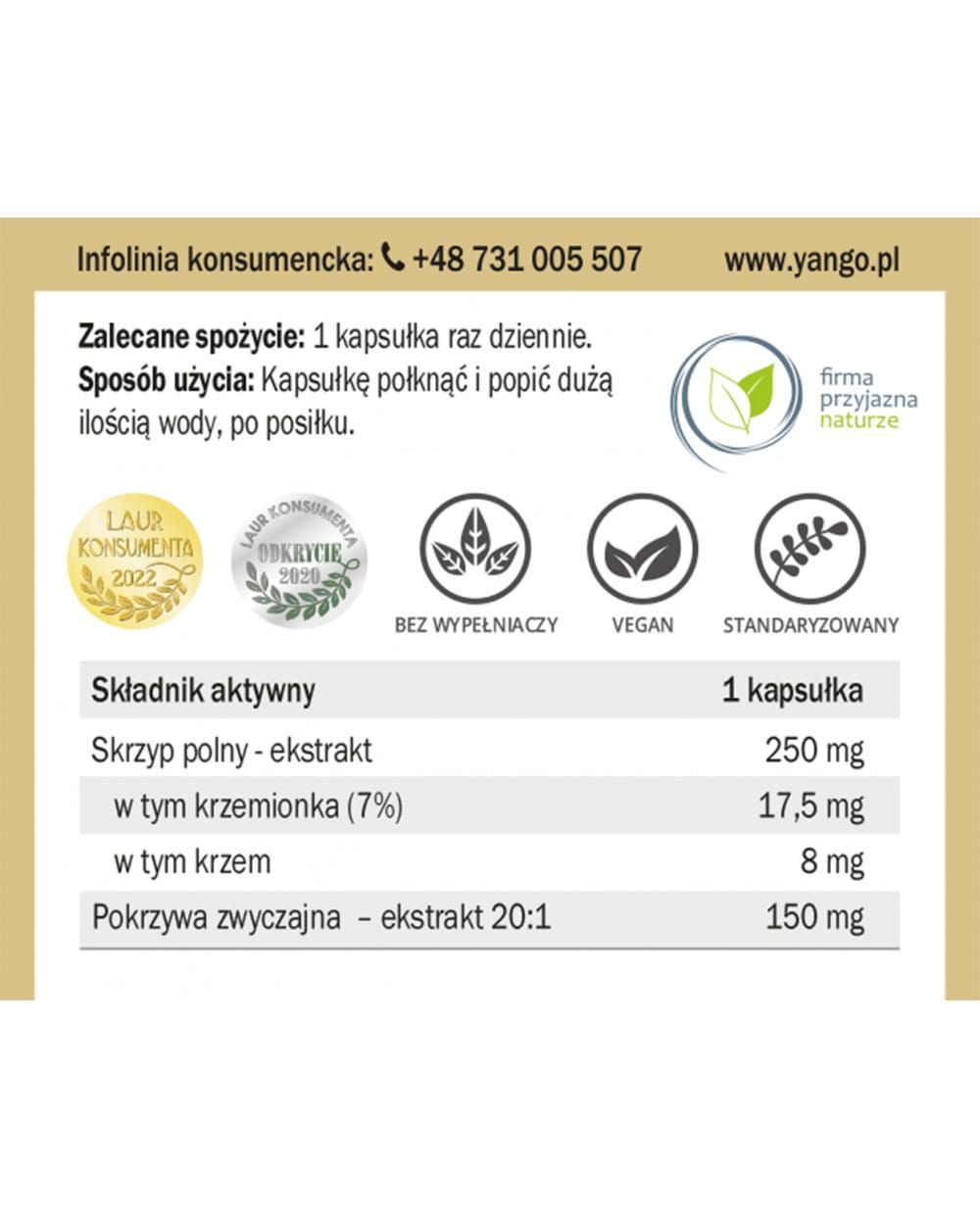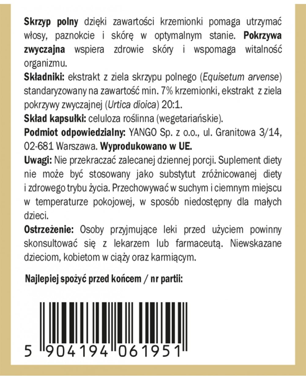 Składniki: ekstrakt z ziela skrzypu polnego (Equisetum arvense) standaryzowany na zawartość min. 7% krzemionki, ekstrakt  z ziela pokrzywy zwyczajnej (Urtica dioica) 20:1.