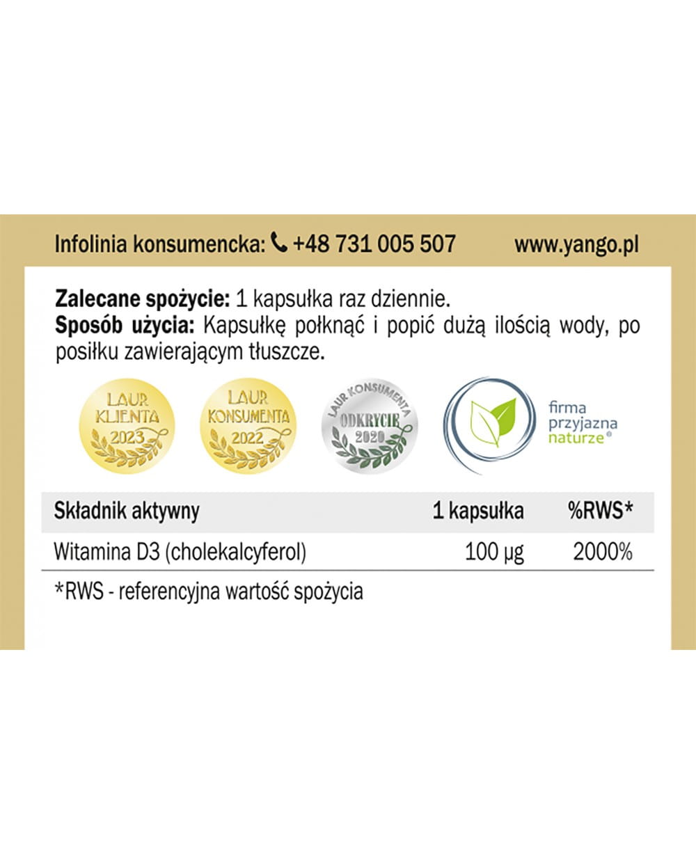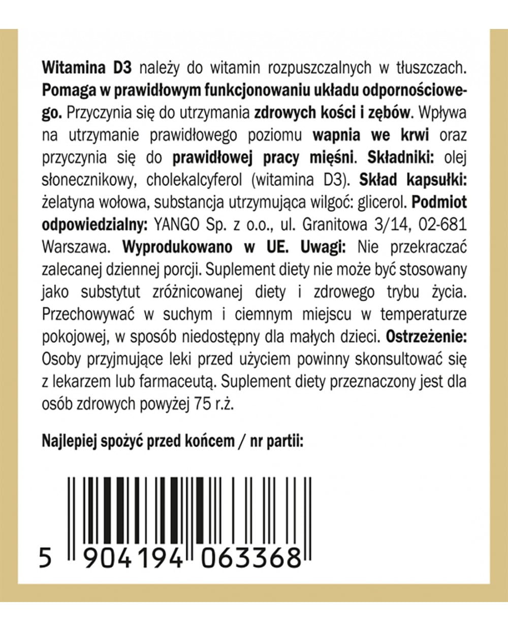 Informacja: Nie przekraczać zalecanej dziennej porcji. Suplement diety nie może być stosowany jako substytut zróżnicowanej diety  zdrowego trybu życia. Przechowywać w suchym i ciemnym miejscu w temperaturze pokojowej, w sposób niedostępny dla małych dzieci. Podmiot odpowiedzialny: YANGO Sp. z o.o. Masa netto: 106,2g.